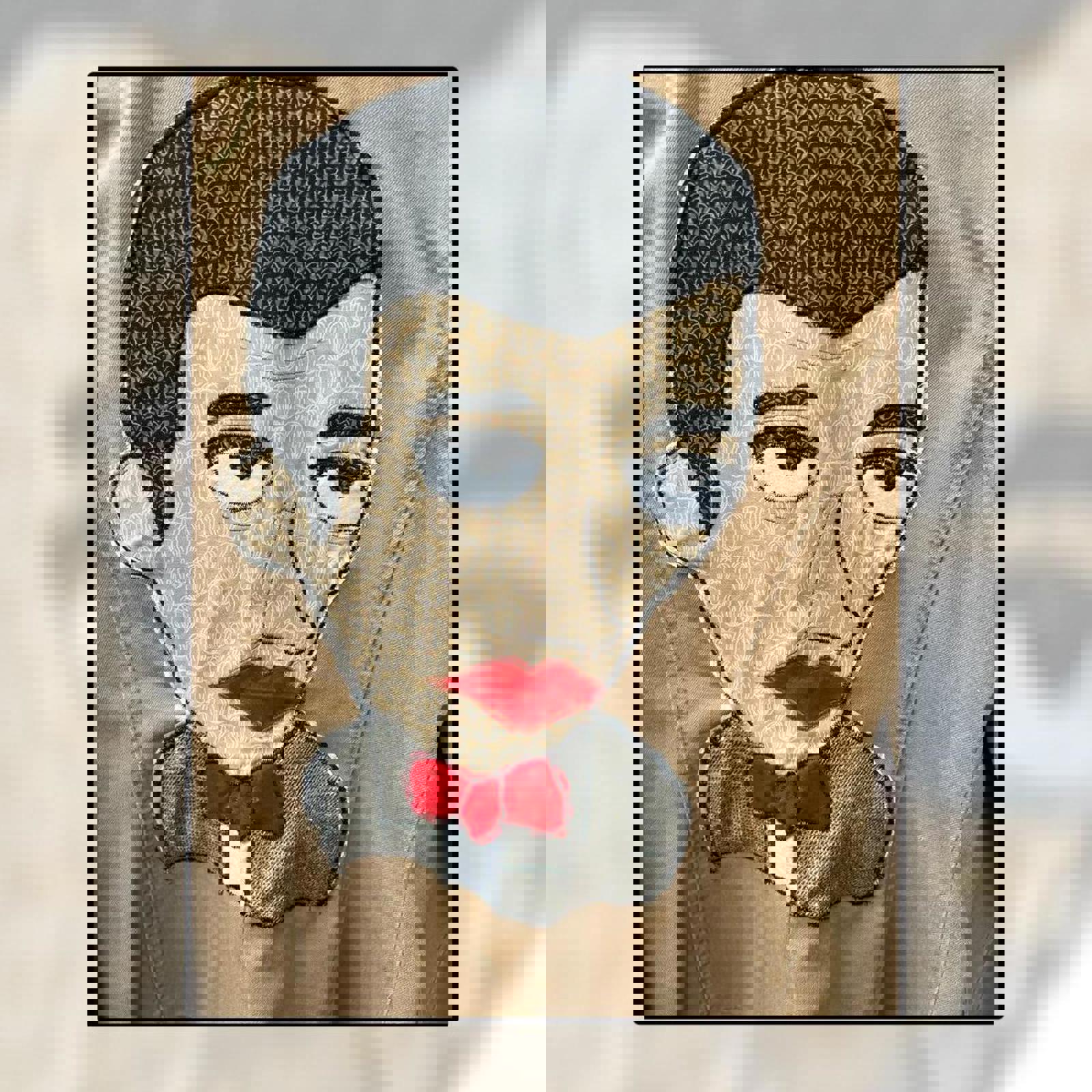 One-of-a-kind Old Navy 100% cotton blazer, size Medium, in a soft light brown tone, transformed into wearable art! The back features a handmade appliqué and embroidery of Paul Reubens as Pee-wee Herman, complete with his iconic grey suit and red bowtie.