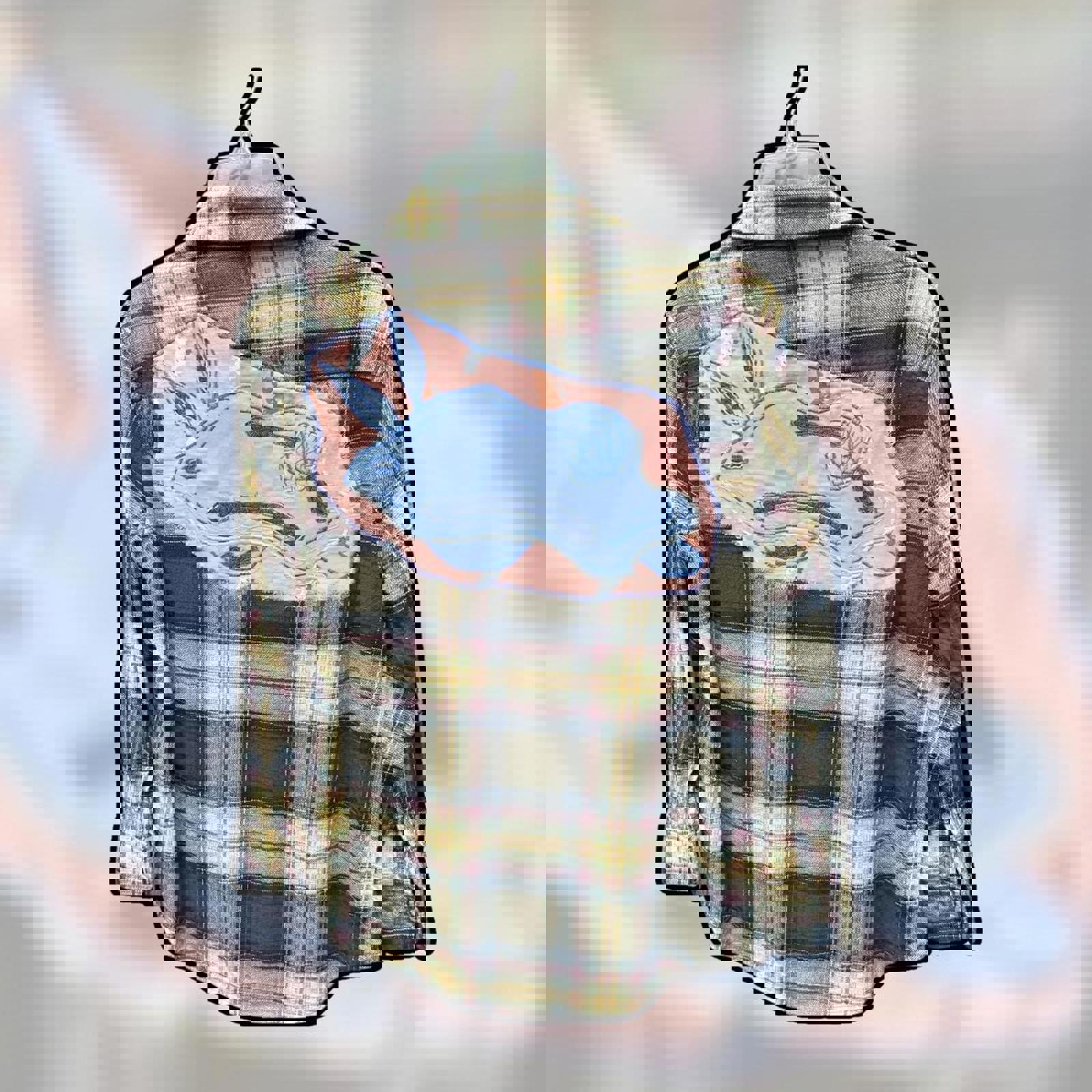 The back features a handmade appliquΓ© of a blue seahare, turning this classic flannel into a whimsical, ocean-inspired statement piece.
