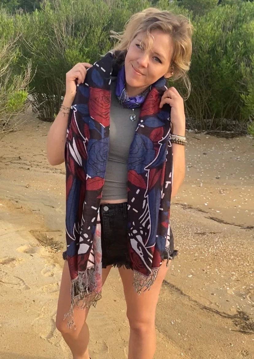 Celebrate the beauty of creativity and gratitude with the Forever Grateful Pashmina, a stunning collaboration between Enlighten Clothing Co. artists Melanie and Justin Chamberlain. This beautiful piece brings together Melanie's hand-drawn design and Justin's meticulous coloring and artistic direction, turning it into a wearable piece of art that will make you feel as grateful as the design itself.